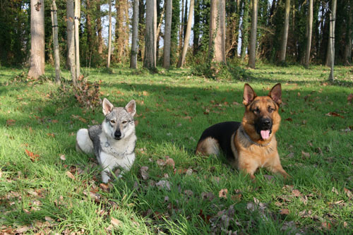 Au fil des promenades avec mes chiens-loups, je rencontre souvent des personnes qui comparent le chien-loup au berger-allemand. Aussi j'ai pris le cliché suivant où apparaissent un CLT et un BA afin que vous puissiez vous rendre compte des diférences majeures entre ces deux races.