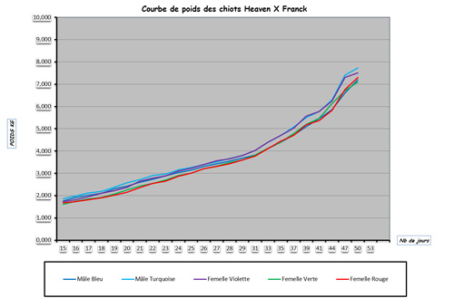 Les chiots sont pesés tous les jours jusqu'à 1 mois afin de vérifier leur croissance et de déceler d'éventuel soucis de santé puis tous les 2 jours jusqu'à 6 semaines et enfin tous les 3 jours.