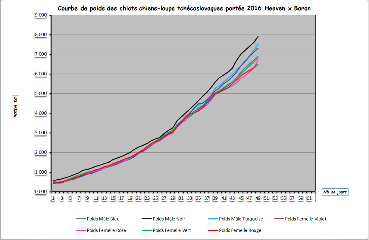 Voici la courbe de poids des chiots de la naissance à 7 semaines