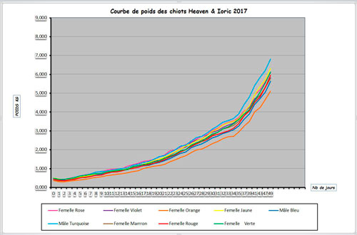 Courbe de poids des chiots d'Heaven et Ioric de la naissance à 7 semaines